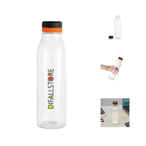 Botella de plástico transparente con tapa a rosca color negro mate con anillo de silicona de diferentes colores.