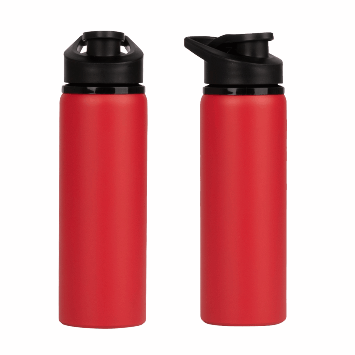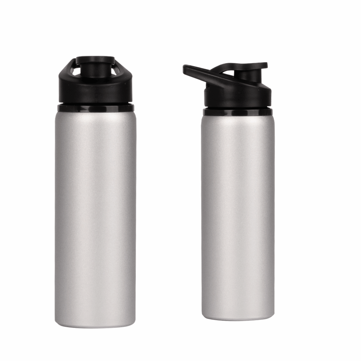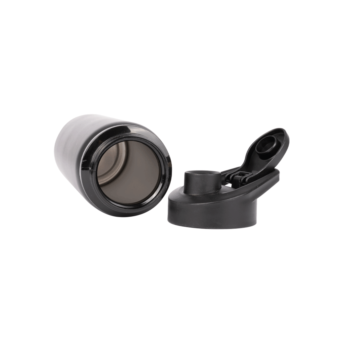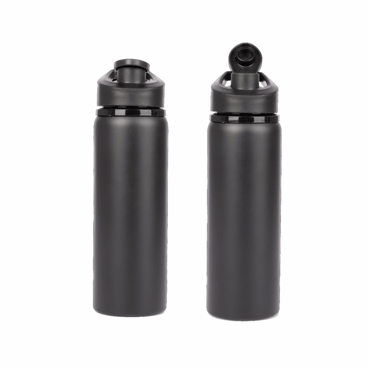 Sport Bottle botella metálica de Acero Inoxidable 304 SS modelo «APIA», con tapa rosca de plástico PP negro, asa de sujeción y anillo de silicona, anti-derrame. Producto BPA FREE.