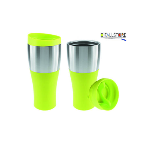 Coffee Mug grande de 470 ml plástico «PP-FRESH», tapa rosca y banda de Acero Inoxidable ideal para imprimir logos. Presentación en caja de cartón plateado.