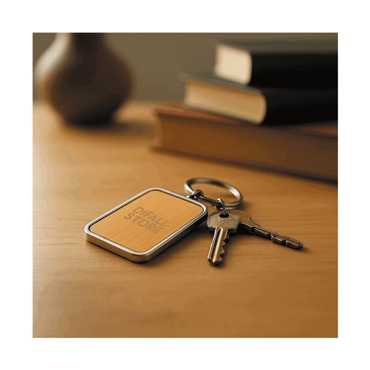 Llavero con forma rectangular. Estructura metálica con aleación de zinc con acabado brillante y panel frontal de bambú barnizado.